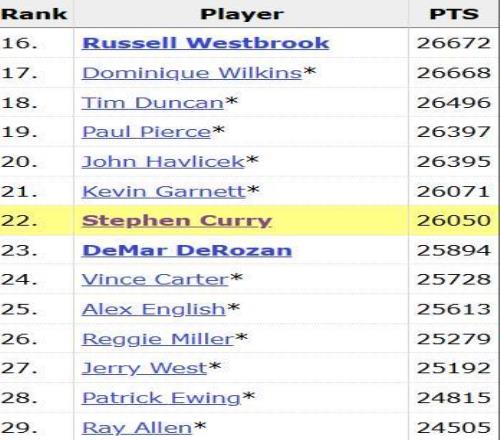 排在第20位的是绿军名宿哈弗里切克,库里距离他还有300多分的差距,不出意外库里在本赛季中期就能连续超越哈弗里切克和皮尔斯杀进历史前二十。